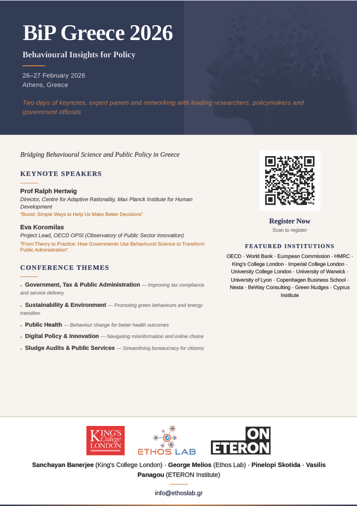 The deadline for submission of abstracts is 12 January 2026 and we will respond to you with a final decision before 16 January 2026. We welcome submissions that explore the role of behavioural insights in policymaking across diverse fields, including (but not limited to) environment, health, climate change, communications, online safety, public policy, welfare studies, ethics, philosophy, and marketing. While not essential, a focus on Greece and/or Europe is particularly encouraged.